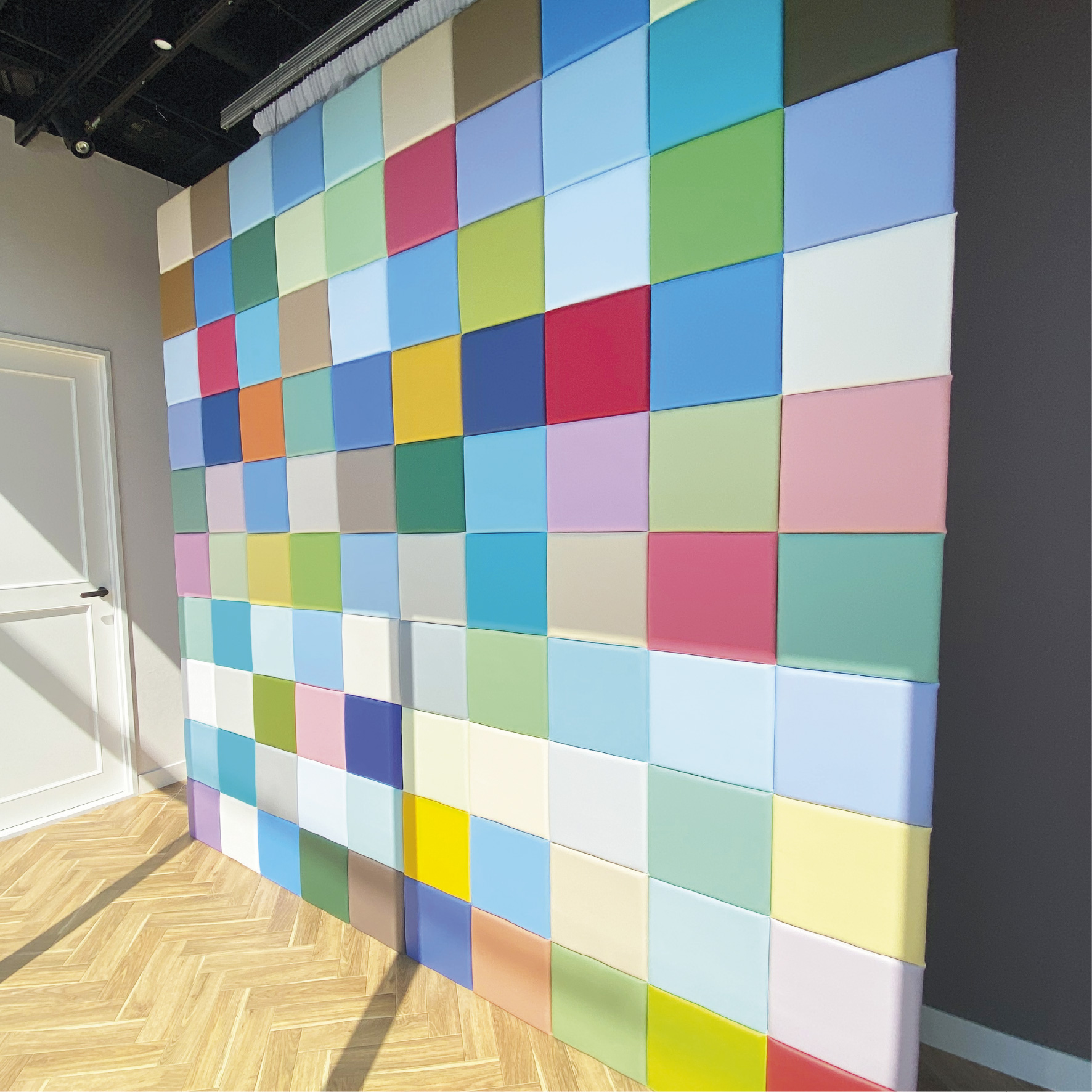 現在、I・C・T PLAZAのウインドウディスプレイに壁飾パネルを設置しております。モザイク調のように様々な色のパネルを組み合わせ、青や緑を基調とした爽やかな雰囲気に仕上げました✨